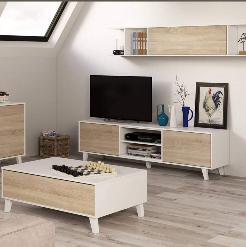 طقم قطعتين ترابيزة قهوة و ترابيزة تلفزيون 180- أبيض مع بنى - TV04